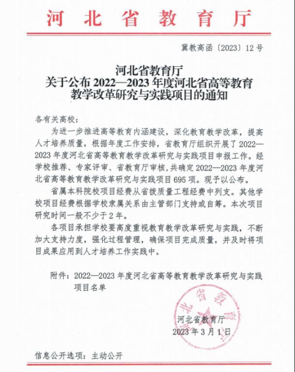 近日,河北省教育厅公布了2022-2023年度河北省高等教育教学改革研究与实践项目名单,必赢官网共有4项教育教学改革研究与实践项目获批立项。