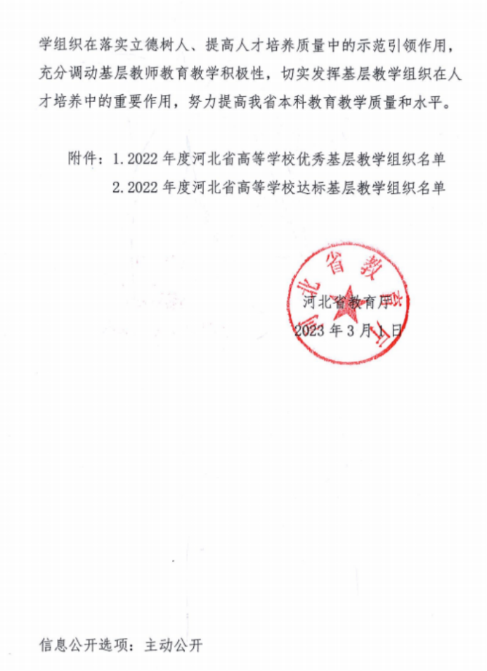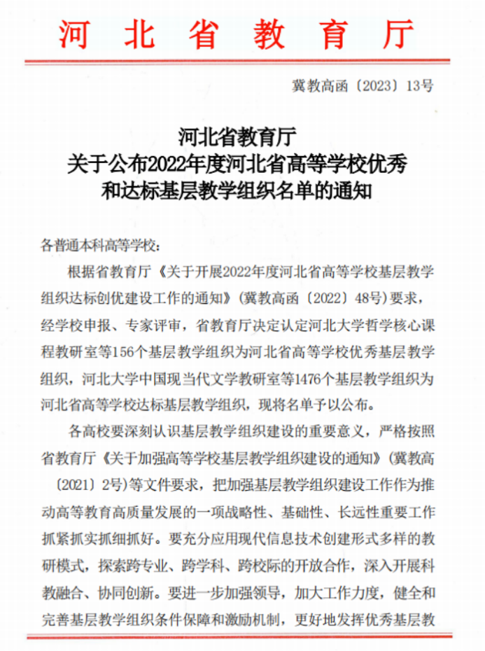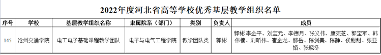 近日,河北省教育厅公布了2022年度河北省高等学校优秀和达标基层教学组织的名单,必赢官网电工电子基础课程教学团队被认定为优秀基层教学组织,工商管理专业教研室等17个基层教学组被认定为达标基层教学组织。