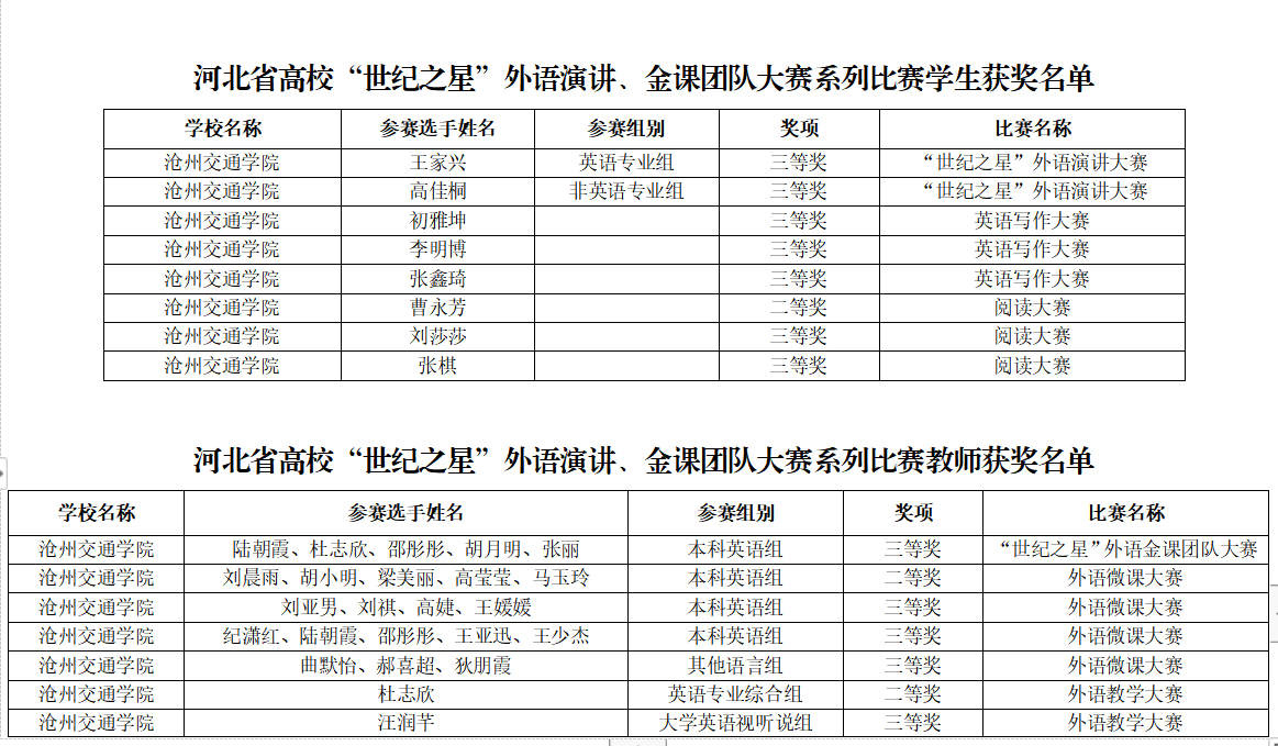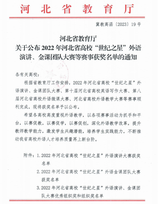 近日,河北省教育厅发布了《河北省教育厅关于公布2022年河北省高校“世纪之星”外语演讲、金课团队大赛等获奖名单的通知》(冀教高函〔2023〕19号),此系列比赛中,必赢官网外国语学院多名师生共获奖15项。