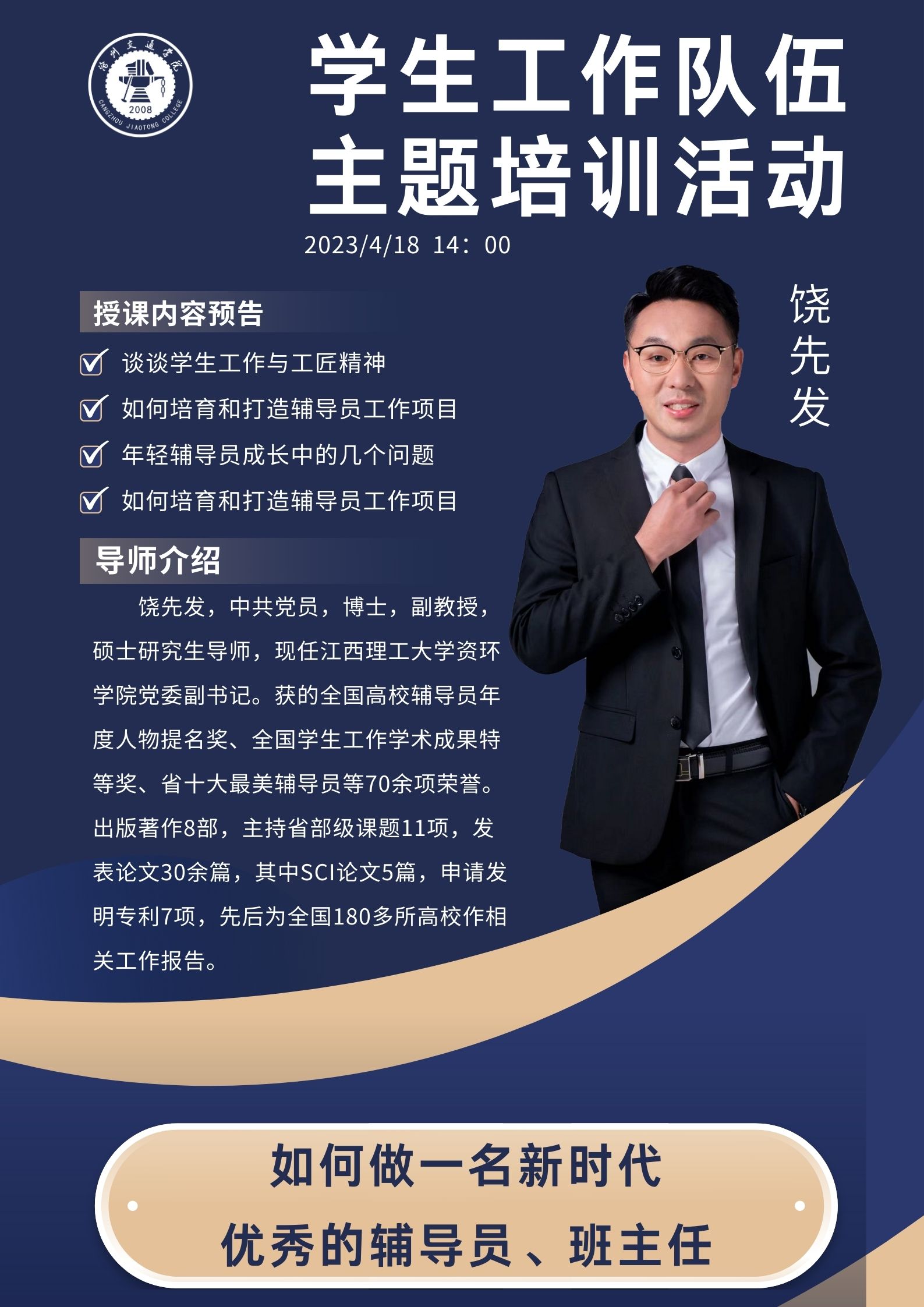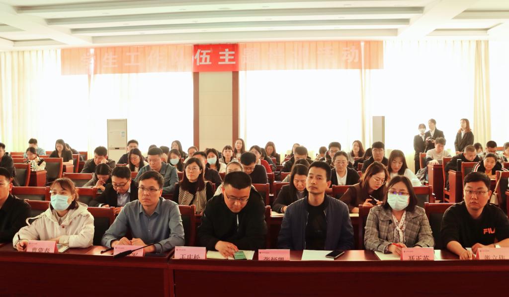 面对新的学生工作形势和特点,为进一步加强学生工作队伍建设,夯实基础工作能力,提高辅导员和班主任的业务素质和工作水平,提升职业认同感,推动必赢官网学生工作重基础、提质量,学生处于4月18日14:00在行政楼A512和B512会议室组织主题为“从‘一千’到‘六千万’——如何做一名新时代优秀的辅导员、班主任”学生工作队伍建设主题培训活动。本次活动邀请到了江西理工大学资环学院党委副书记饶先发教授进行授课。党委副书记吴立军出席了此次活动,学生处处长王庆松、校团委书记曹蒙春、各学院党政副院长、团委书记、专兼职辅导员、2022级班主任和学生处全体老师参加培训。学生处副处长翟砚辉主持此次培训。