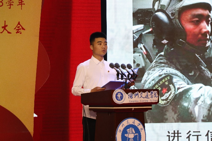 优秀青年学生代表赵学泽发言。他作为一名光荣的退役军人,为大家讲述了参军过程中的美好回忆和所获的优异成绩。在校期间,他有着十分丰富的社会实践经历,他号召大家积极投身于社会服务中去。他表示,青年大学生应当积极努力奋斗,不负青春韶华,逐梦砥砺前行。