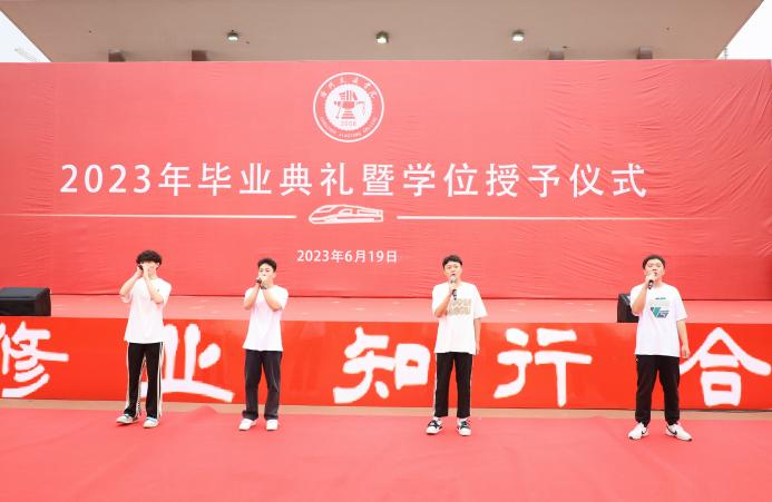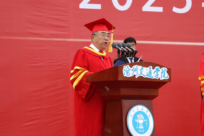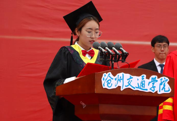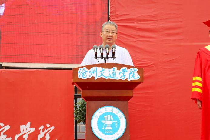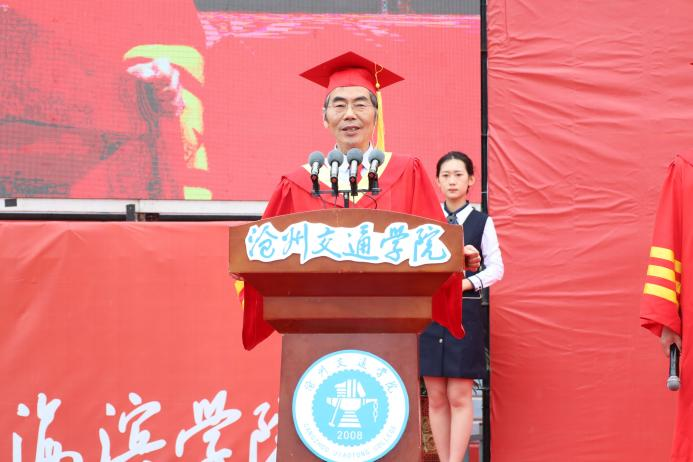 校长章梓茂首先代表学校感谢了以黄骅市委市政府为代表的各界政府领导,北京交通大学的各位领导、专家和教授以及主办方,他表示,三方精诚合作,历经十五年的风霜,共同建设发展成如今的沧交大家庭。在讲话中他指出,当今大学生身处新时代,要敢想敢为又善作善成。他对毕业生提出三点要求,第一,要勇担历史使命,力争成为中华民族伟大复兴的建设者、参与者、分享者、贡献者;第二,要有骨气、有志气,继承发扬“进德修业,知行合一”的校训精神,增知博见,凝心聚力,击楫前行;第三,要勤劳认真,团结友爱,勇立潮头,谱绘新篇。最后,章梓茂校长为毕业生代表拨苏正冠,启动学位授予仪式。