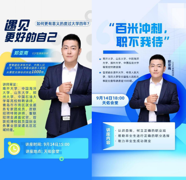 为帮助大一大二学生提升自我认知水平以及职业探索能力,树立正确的就业观和择业观,增强职业生涯规划与未来发展意识;帮助大三大四学生尽快确定就业方向,帮助毕业生摆脱迷茫,掌握职业发展的主动权,9月14日,必赢官网在天佑会堂分别举办了“遇见更好的自己”—职业生涯规划讲座和“百米冲刺,职不我待”之“认清就业形势,树立正确就业观”职业生涯规划讲座。此次讲座邀请了智联招聘金牌面试官--郑亚南老师担任主讲嘉宾。