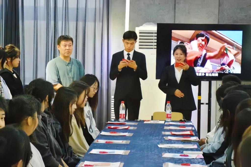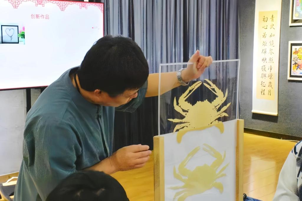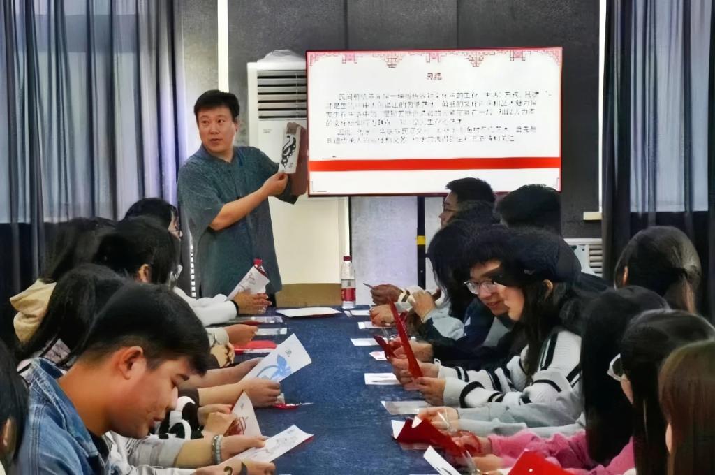 活动中,白金磊老师着重讲解了渤海渔村剪纸传承人韩宝菊的部分代表作品以及韩老师对剪纸艺术的独特见解“让剪刀随心走”的内涵,讲解了渤海渔村剪纸艺术的起源、发展、特点等,并指出剪纸艺术已经随着时代而逐步创新,让同学们更加清晰地了解剪纸艺术。