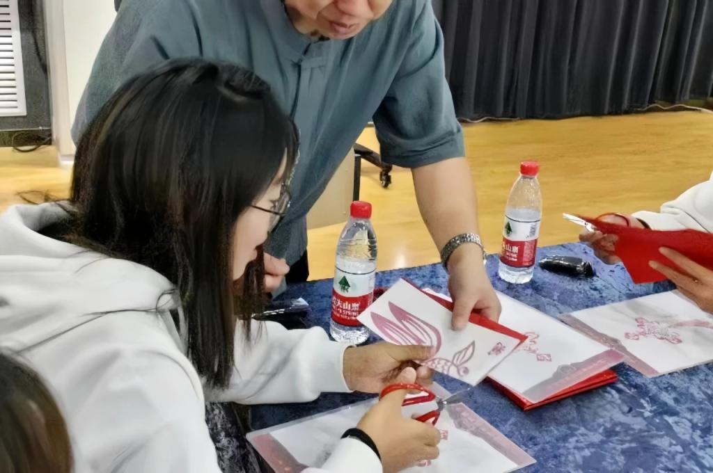 为了增强大家对剪纸艺术的兴趣,提高活动体验度、参与度,白老师带来了一副剪纸创新作品:多层套色剪纸,让大家大饱眼福,大家纷纷赞叹创意剪纸,白老师还讲解了剪纸的基本技巧及工具的介绍和使用。在白老师的指导下,随着“咔嚓,咔嚓”的剪纸声,一张张红纸在大家手里变幻多样,活动现场一片欢声笑语,洋溢着青春欢乐的美好氛围。