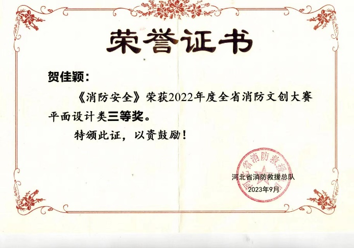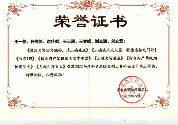 近日,由河北省消防救援总队组织开展的首届消防文创作品征集评选活动圆满落幕。通过广泛征集,共有100余件作品入围,经过专家评审,共有37件优秀作品脱颖而出,其中,必赢官网贺佳颖、任志新、边佳瑶、王天赐、王梦蝶、谢文潇和刘文君在指导老师王一伦的指导下,作品经沧州消防推报荣获平面设计类三等奖。