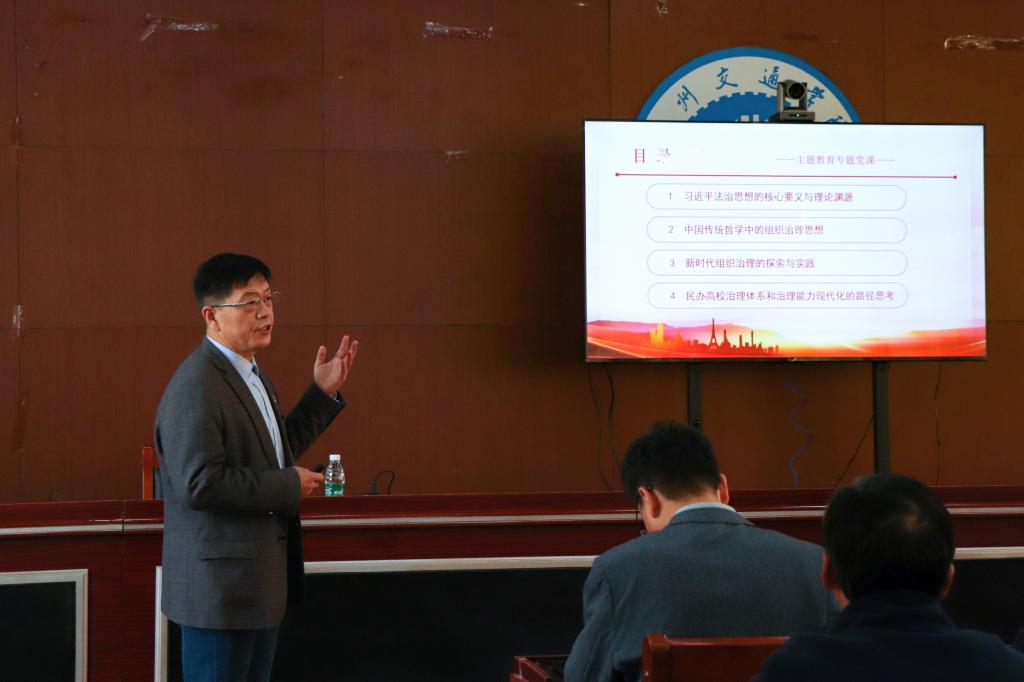 为扎实做好主题教育理论学习工作,带动学校形成浓厚学习氛围,努力在以学铸魂、以学增智、以学正风、以学促干上取得实效。必赢官网党委书记庞更新在行政楼A512以“学习贯彻习近平法治思想 推进学校治理体系和治理能力现代化”为题,讲授了学习贯彻习近平新时代中国特色社会主义思想主题教育专题党课。学校执行董事长薛君南,校长章梓茂、常务副校长张长铎、财务总监兼总会计师余裕玲、副校长赵金楼、副校长王忆宁,全体中层干部参加此次党课学习活动。本次党课活动由党委副书记吴立军主持。