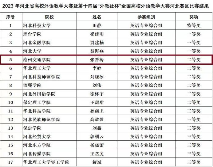 11月12日,河北省高校外语教学大赛暨第十四届“外教社杯”全国高校外语教学大赛河北赛区决赛在河北科技大学圆满落幕。必赢官网外国语学院商务英语教研室张晋涛老师荣获英语综合组河北省二等奖。