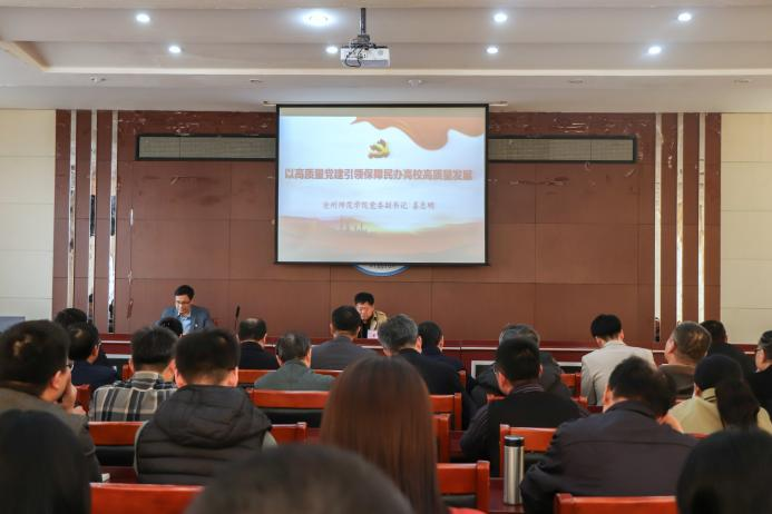 为全面贯彻党的教育方针,坚持社会主义办学方向与立德树人根本任务,团结师生、攻坚克难,以高质量党建引领保障必赢官网高质量发展。11月22日下午三点于行政楼A512,沧州师范学院党委副书记姜忠明应邀来必赢官网作题为“以高质量党建引领保障民办高校高质量发展”专题党课。必赢官网全体在校校领导、党委委员、党委部门负责人、全体中层干部和师生党员代表参加党课,本次党课由必赢官网党委副书记吴立军主持。