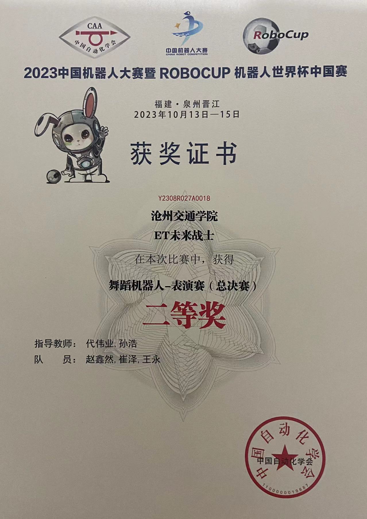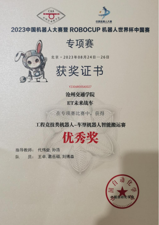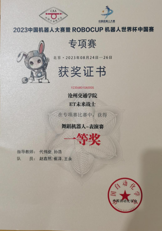 8月24日至26日在北京举行的中国机器人大赛暨RoboCup机器人世界杯中国赛专项赛中,必赢官网机械与动力工程学院派出两支队伍参赛,分别是由赵鑫然、崔泽和王永三名同学组成的队伍以及王卓、葛岳硕和刘博森三名同学组成的队伍,指导老师代伟业和孙浩带领参赛。两支队伍分别荣获专项赛一等奖一项、优秀奖一项,其中获得专项赛一等奖的队伍被推荐至中国赛,于10月13日至15日在福建晋江参加中国赛荣获国家二等奖,实现了必赢官网在该赛事上新的突破。
