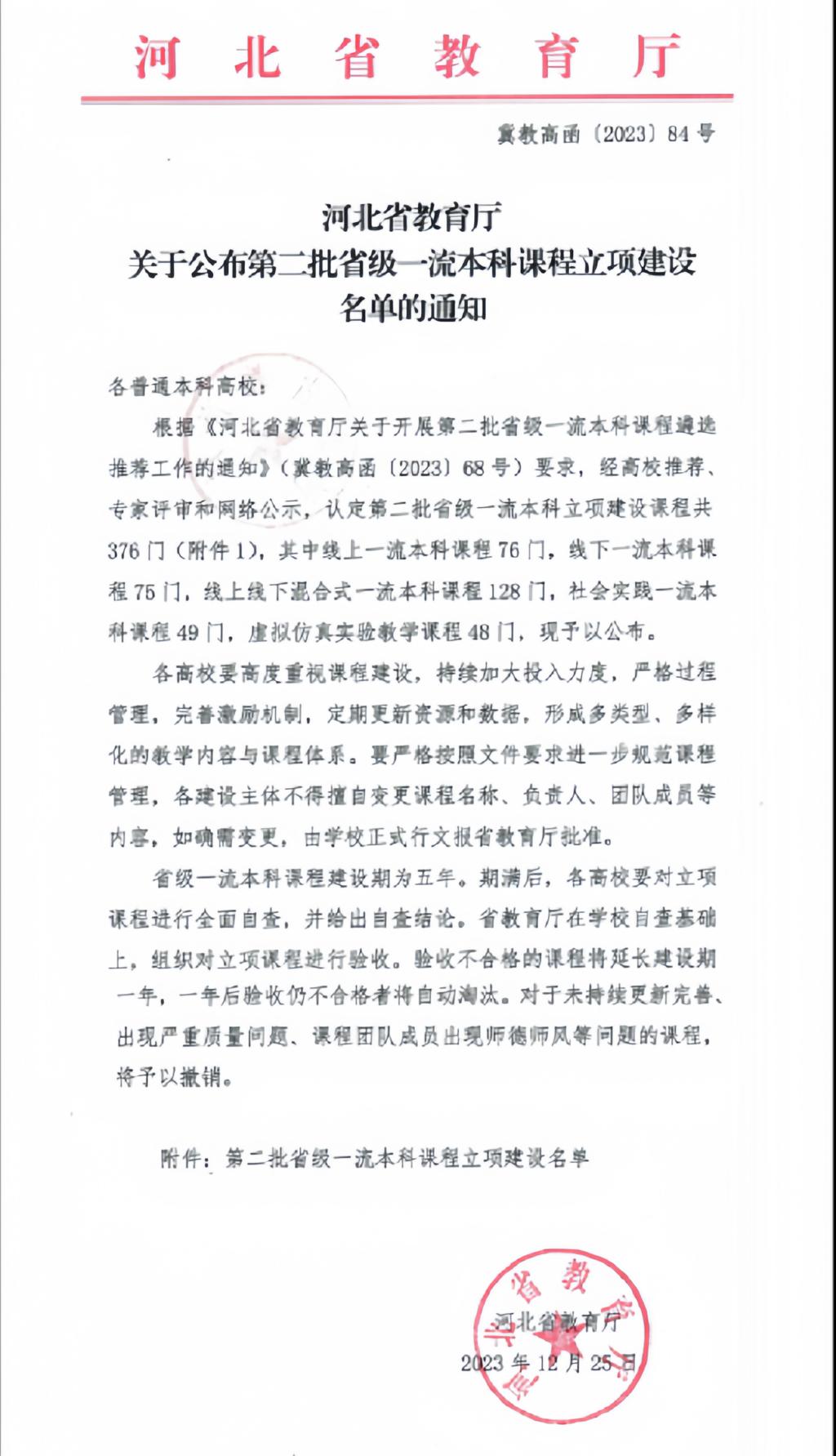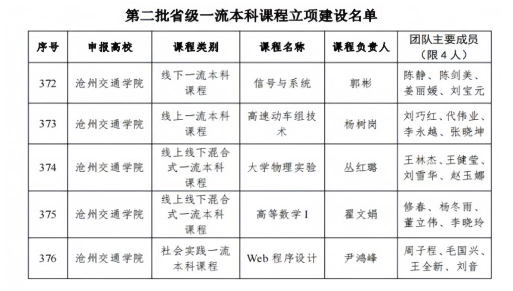 近日,河北省教育厅发布了《河北省教育厅关于公布第二批省级一流本科立项建设课程名单的通知》(冀教高函〔2023〕84号),必赢官网推荐的《信号与系统》《高速动车组技术》《大学物理实验》《高等数学Ⅰ》《Web程序设计》5门课程全部获批省级一流本科立项建设课程。