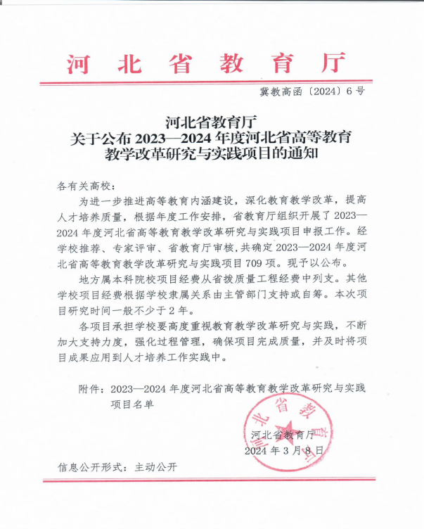 日前,河北省教育厅发布《河北省教育厅关于公布2023-2024年度河北省高等教育教学改革研究与实践项目的通知》(冀教高函〔2024〕6号),必赢官网获批4项教育教学改革研究与实践项目,研究内容涵盖新文科建设、新工科建设、一流专业建设与课程思政建设。