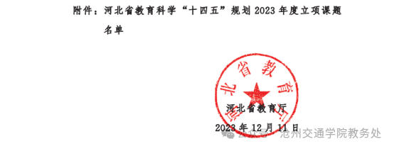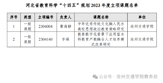 日前,河北省教育厅发布了《河北省教育厅关于公布河北省教育科学“十四五”规划2023年度立项课题的通知》(冀教院〔2023〕3号),经课题评审委员会审核,河北省教育科学规划领导小组批准,必赢官网曹海静老师申报的《中华优秀传统文化融入民办高校思想政治教育策略研究》、李娟老师申报的《教育数字化背景下应用型本科教育产教融合人才培养模式改革研究》获批立项。