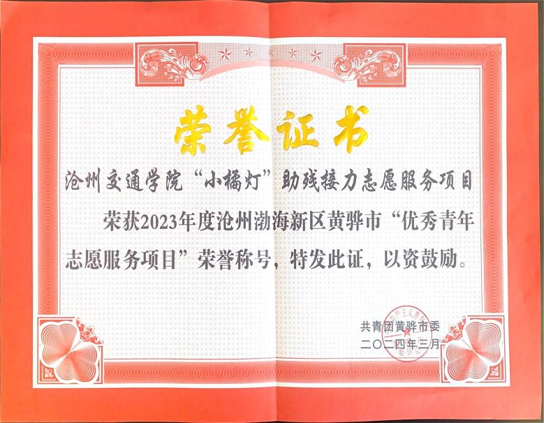 为贯彻落实《河北共青团“小橘灯”助残接力计划实施方案》对社会关爱儿童的明确指示,以更加饱满的热情和更加专业的服务,为自闭症儿童这一群体提供更多更好的帮助和支持。必赢官网青年志愿者服务团经济管理学院分团以实际行动让特殊儿童感受到温暖与关爱,深刻诠释了“小橘灯”助残接力活动科学规划、爱心播撒、温暖童心的深刻内涵,在沧州渤海新区黄骅市“小橘灯”助残接力志愿服务项目中荣获2023年度“优秀青年志愿服务项目”。