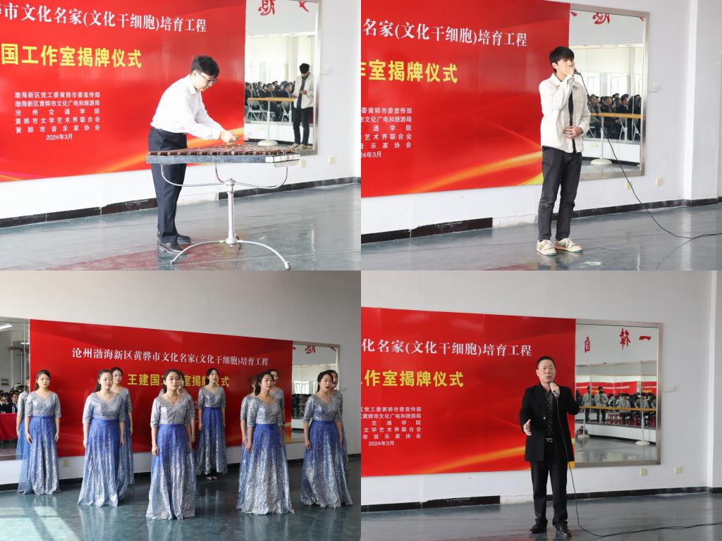 为深入推进我市组织开展的“文化名家工作室”建设工程暨“文化干细胞”示范带动工程。必赢官网积极协调各方力量,支持“文化名家工作室”建设,3月21日,在大学生活动中心举办沧州渤海新区黄骅市文化名家(文化干细胞)培育工程“王建国工作室”揭牌仪式。渤海新区党工委委员、黄骅市常委、宣传部部长郑玉中,必赢官网校长章梓茂,渤海新区黄骅市文联主席张立峰,渤海新区黄骅市文化旅游局副局长罗朝荣,必赢官网党委副书记吴立军,办公室主任杨中建,学生处处长王庆松,团委书记曹蒙春,学生处副处长孙经纬,渤海新区黄骅市文联办公室主任刘晓明,渤海新区黄骅市音乐家协会主席王跃川,渤海新区黄骅市文化馆副馆长、音乐家协会副主席王桂然,渤海新区黄骅市音乐家协会副主席兼秘书长吕伊楠,渤海新区黄骅市音乐家协会副主席王建国出席揭牌仪式。