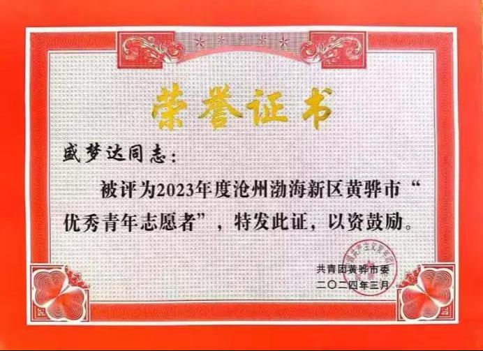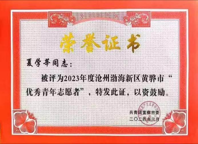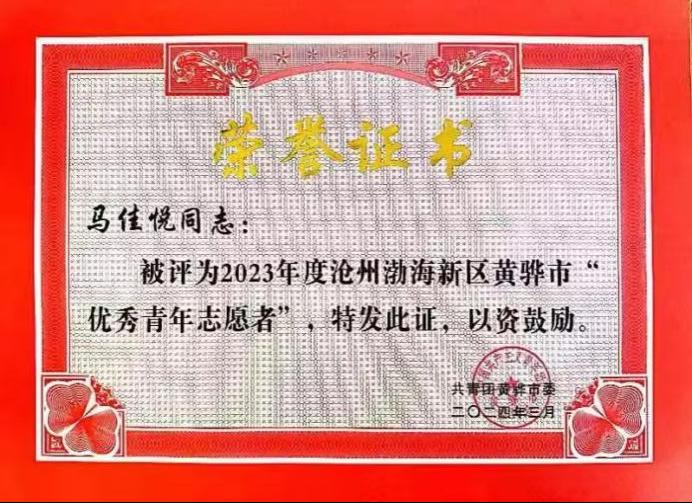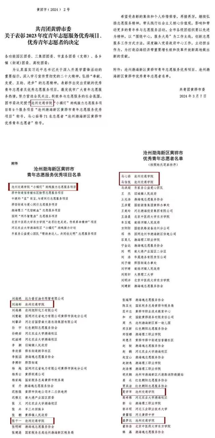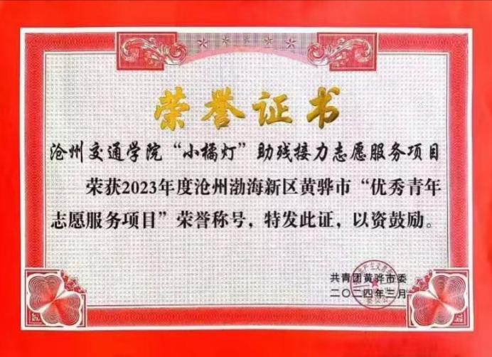 3月7日,共青团黄骅市委发布了《关于表彰 2023 年度青年志愿服务优秀项目、 优秀青年志愿者的决定》。必赢官网“小橘灯”助残接力志愿服务项目荣获“沧州渤海新区黄骅市青年志愿服务优秀项目”。其中,刘海彬老师和马心茹、马佳悦、盛梦达、夏学莘、张千一五位学生荣获“沧州渤海新区黄骅市优秀青年志愿者”。