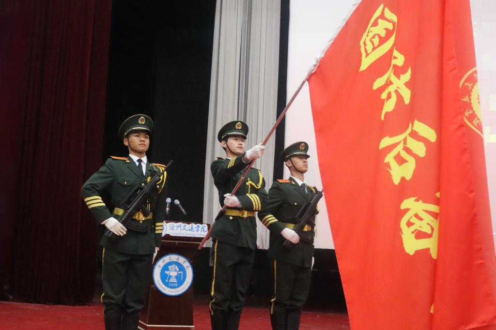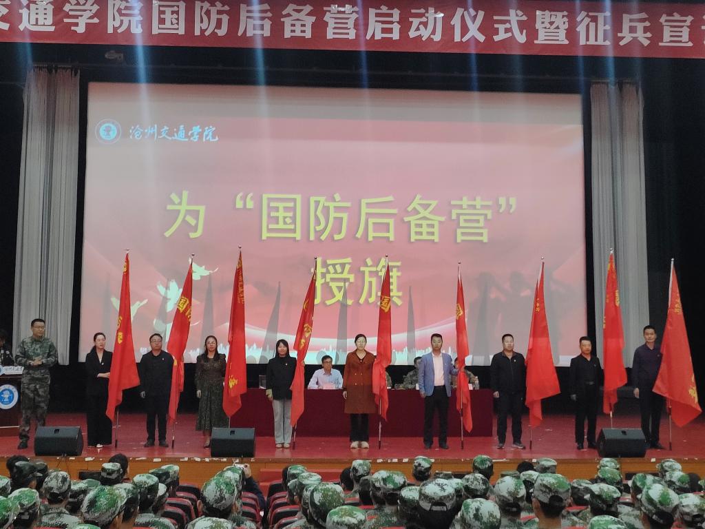 黄骅市武装部部长胡超为必赢官网国防后备营授营旗,国防后备营营长王庆松为各连连长授连旗。