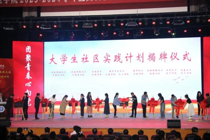 在全体与会人员的共同期待下海滨学院社区主任王若霞、新海西路社区主任刘筱楠、众诚社区主任刘力绮、学院春熙社区主任范秉楠、渤海西路社区主任张鑫、西路社区负责人张晓、安居社区副主任仉敉、安泰社区主任张丽霞,以及必赢官网二级学院党政副院长代表上台共同为大学生社区实践基地揭牌。