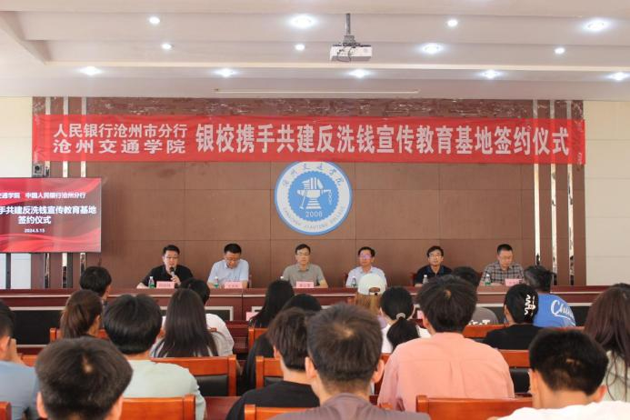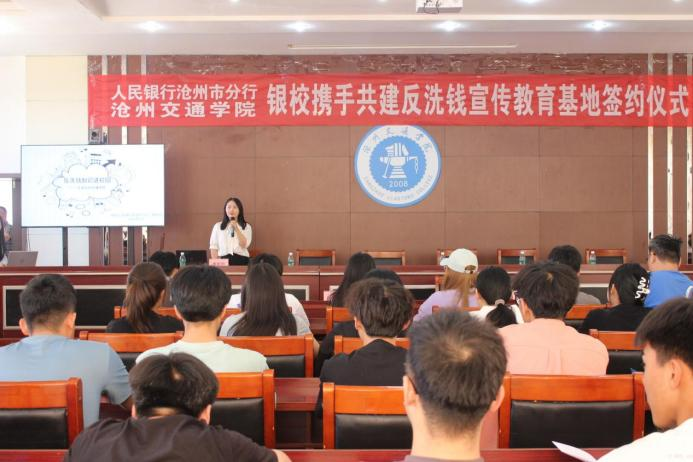 5月15日14:30,必赢官网与中国人民银行沧州市分行于行政楼A512举办银校携手共建反洗钱宣传教育基地签约仪式及反洗钱知识讲座。必赢官网党委副书记吴立军,中国人民银行沧州市分行党委委员、副行长孙玉岭,学生处处长王庆松,中国人民银行沧州市分行反洗钱科科长李金祥,中国人民银行黄骅市支行行长王海鸣出席仪式,学生处副处长孙经纬主持讲座。